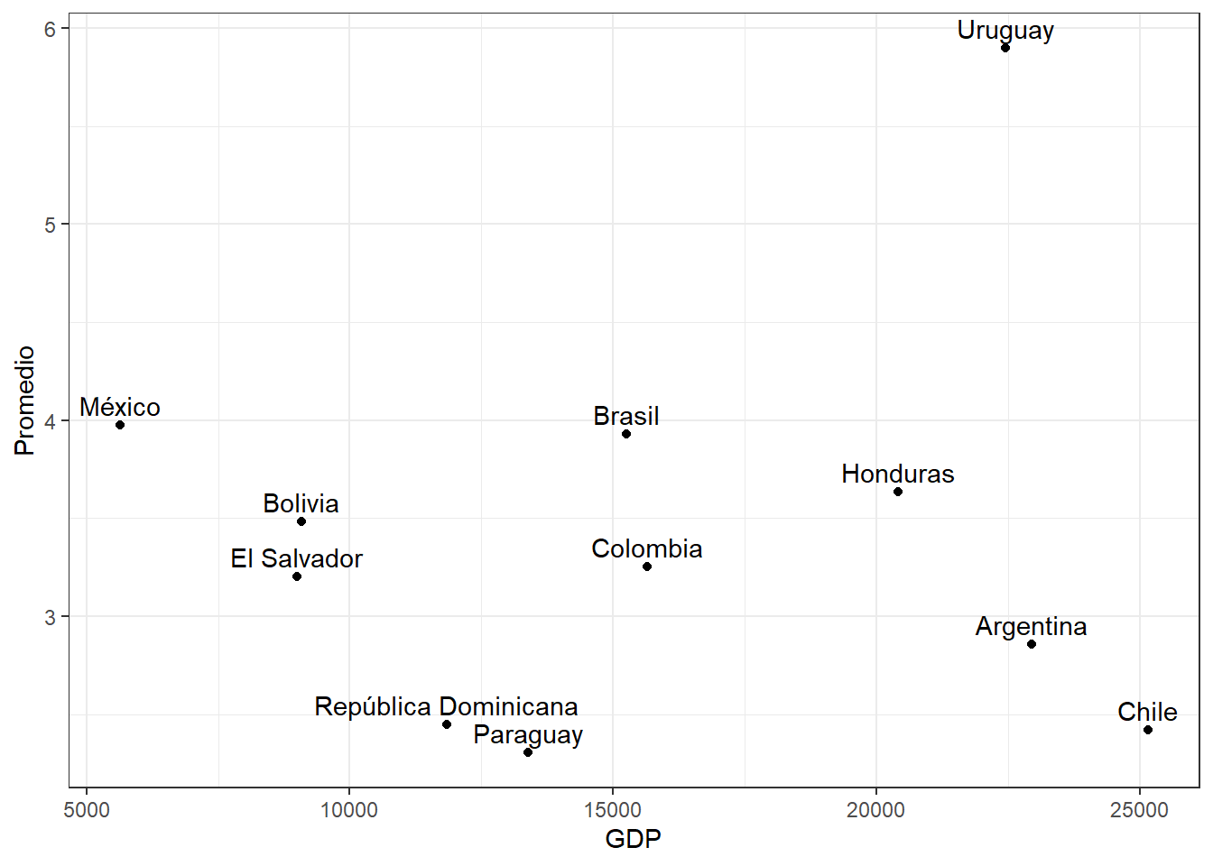 data %>%ggplot(aes(x = gdp, y = promedio, label = idenpa)) +geom_point() +geom_text(vjust =-0.5) +labs(x ="GDP", y ="Promedio") +theme_bw()