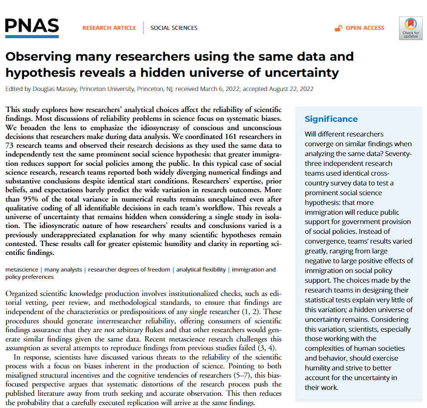 Breznau, et. al, (2023) coordinó una investigación con 161 investigadores de 73 equipos de investigación.